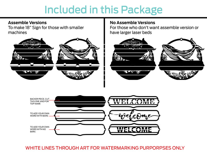 This is a Blue Whale Welcome sign. It also comes with an assemble version designed to fit on smaller laser beds like Glowforge to print a larger sign. All seams are hidden and the final piece is strong. Non Assembly version also included for those with larger lasers or pass-through. Please read the READ ME FILE.