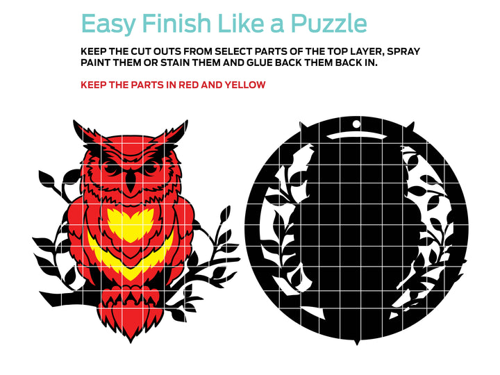 This is a an easy to finish owl sign. It has been designed so you simply paint or stain the pieces and put the pieces back into the top frame like a puzzle or coloring book. Please read the READ ME FILE. The file is currently set to about 14.5" high but you can resize as you wish.